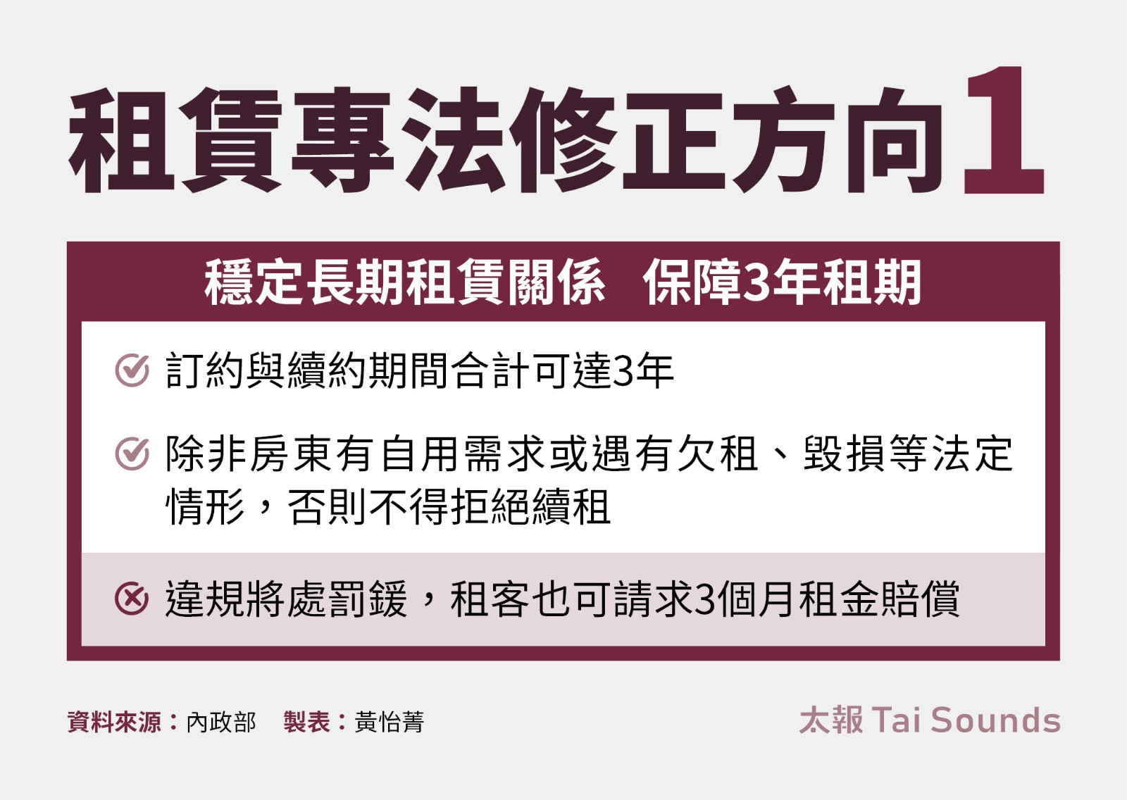 內政部擬定修正《租賃住宅市場發展及管理條例》,第一個修法方向就是穩定長期租賃關係,規範租客享有3年租期保障,除非房東有自用需求或遇欠租、毀損等法定情形,否則不得拒絕續租。