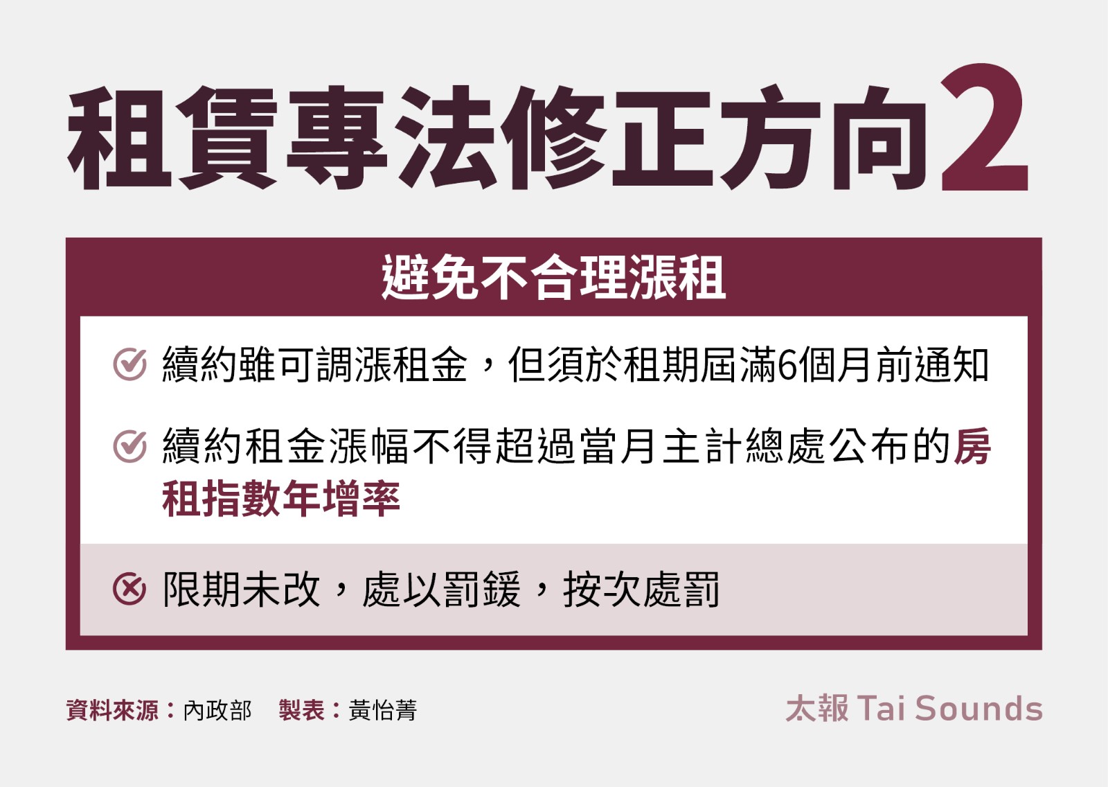 修法方向2》避免不合理調漲 續租漲幅約在2%上下讓房東焦慮卻讓租客認為是跨時代演進的修法方向,莫非就是設定租金調漲天花板。內政部指出,「房東若要漲租,可以,但租約到期前半年,要先告知房客」,而且漲幅不能超過當月行政院主計總處公布的房租指數年增率。