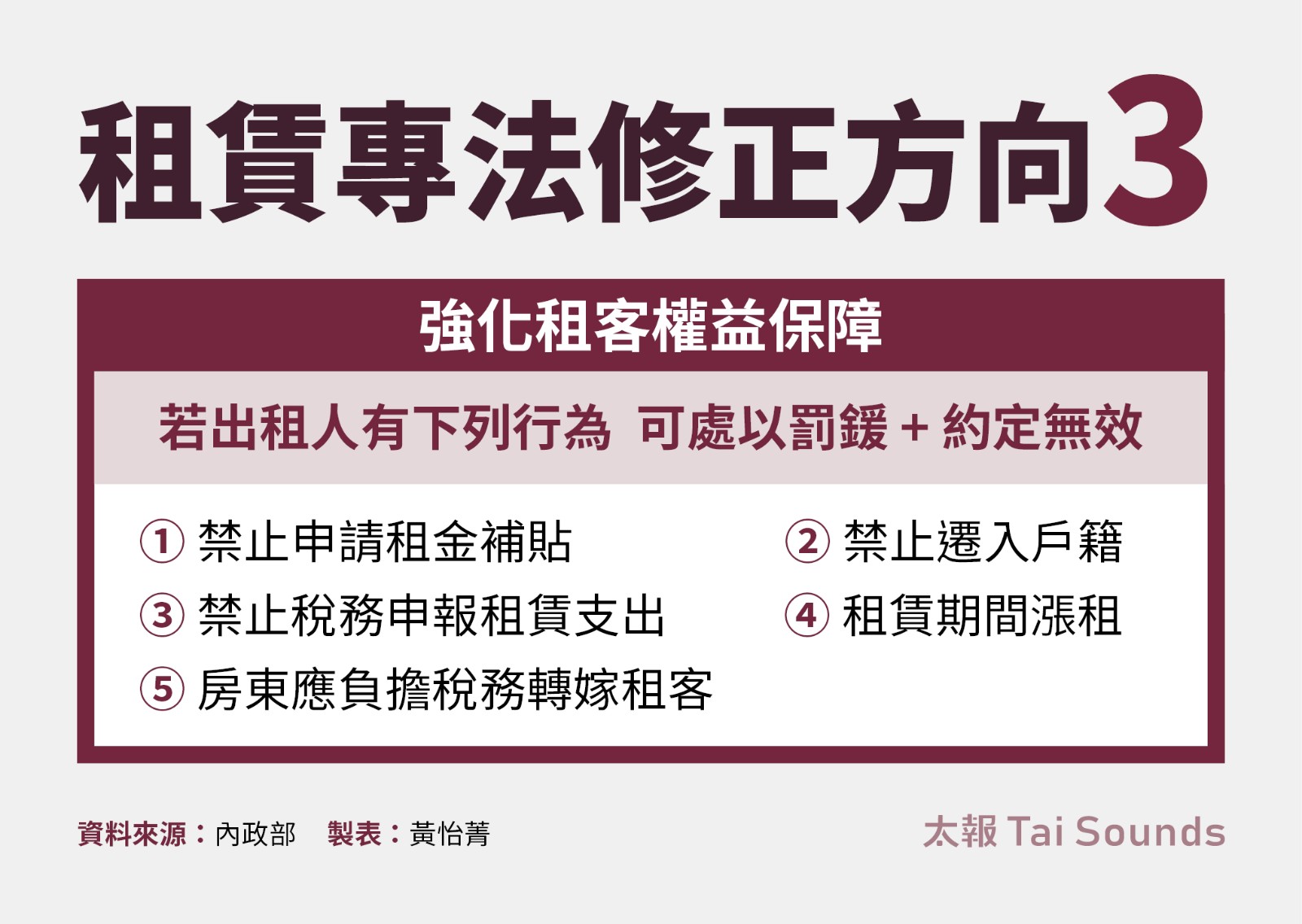 修正方向3》租客申請補貼 房東「不能說NO」前總統蔡英文任內延續至今的租金補貼政策,立意良善卻引發諸多亂象,內政部也研議加嚴管制,房東不得阻撓租客申請補貼、設戶籍或報稅,也不能在租期內任意「轉嫁稅金」,違規不僅會開罰,約定也將不算數。