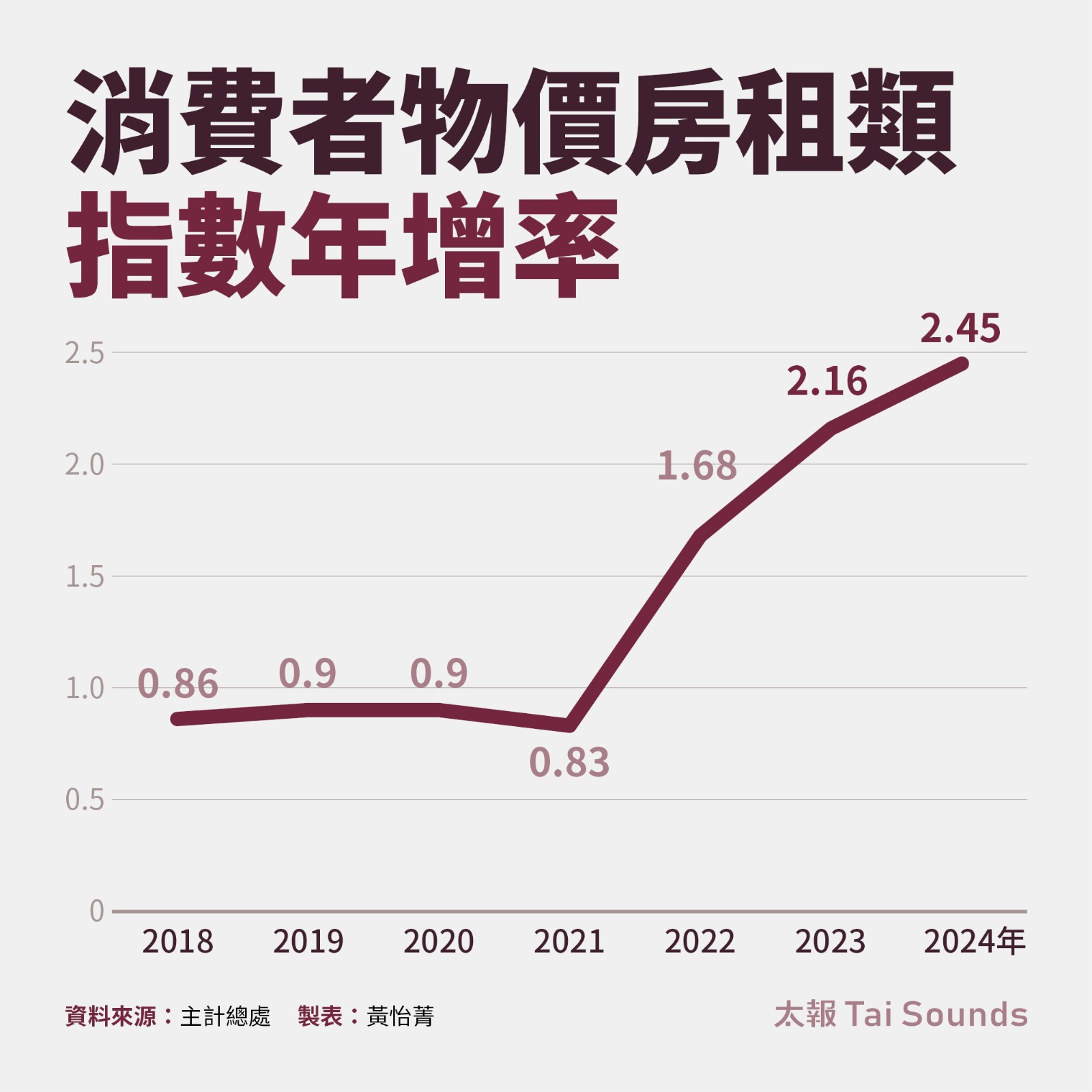 攤開近年房租類指數年增率,2018年0.86%,接著2019年疫情期間連兩年皆為0.9%,2021年0.83%,2022年開始顯著上漲,1.68%,2023年2.16%,2024年2.45%。