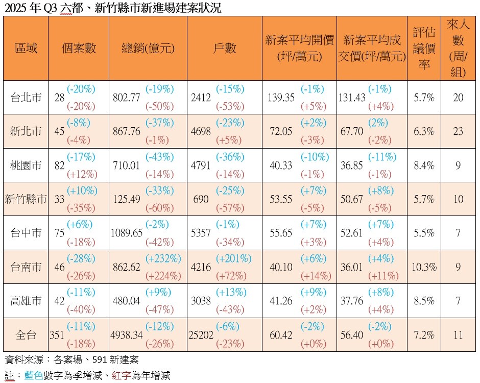 統計第3季進場個案數351件、戶數2.5萬戶,雙雙較前一季及去年同期衰退。591新建案提供
