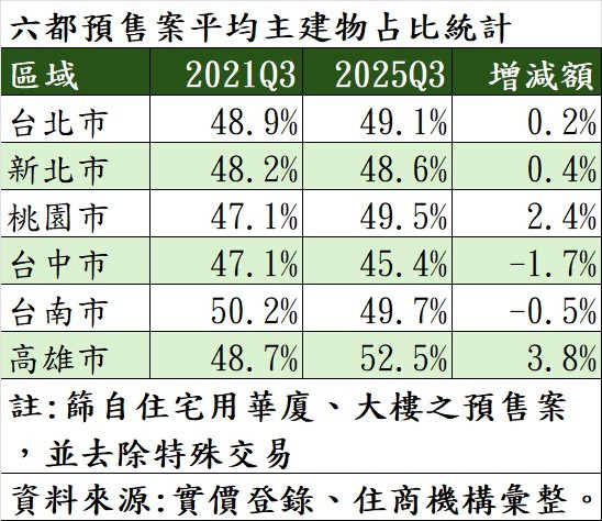根據實價登錄統計,台北、新北、桃園及高雄第3季新案主建物占比皆呈現成長,其中桃園、高雄平均主建物占比約49.5%、52.6%,與2021年同期相比增加2.4、3.8個百分點。住商機構提供