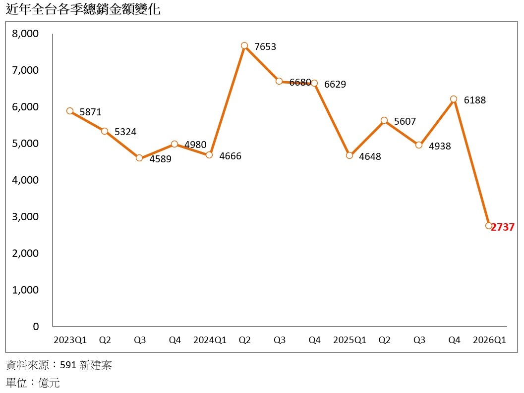 根據591新建案統計,七都開季推案持續萎靡,總銷金額為2,736.9億元 ,悉數創下單季歷史新低紀錄。591新建案提供