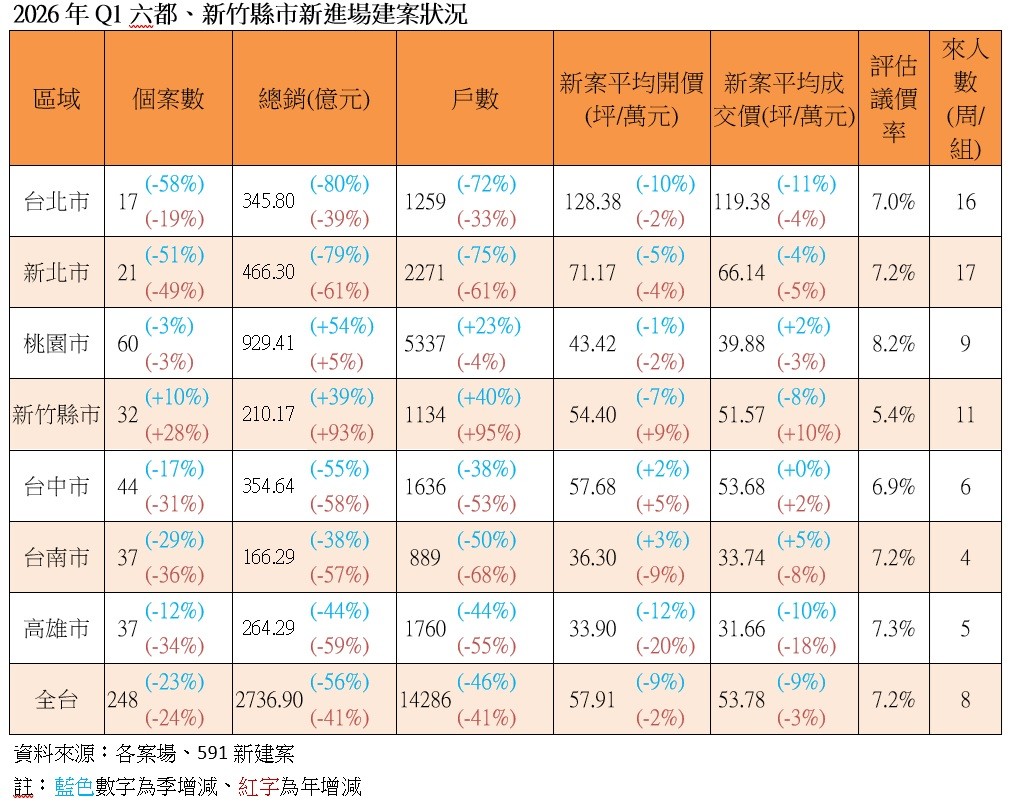 根據591新建案統計,全台六都及新竹開季推案持續萎靡,進場建案共248件,戶數約1.43萬戶,總銷金額為2,736.9億元 ,均創下單季歷史新低紀錄。另外,全台平均開價與成交單價分別下修至57.9萬與53.8萬元,不只雙雙接近兩年前水準,更較上季修正近1成;雙北、桃園及高雄等縣市無論較上季及去年同期,開價也紛紛下跌,馬年開局依舊籠罩在低氣壓中。