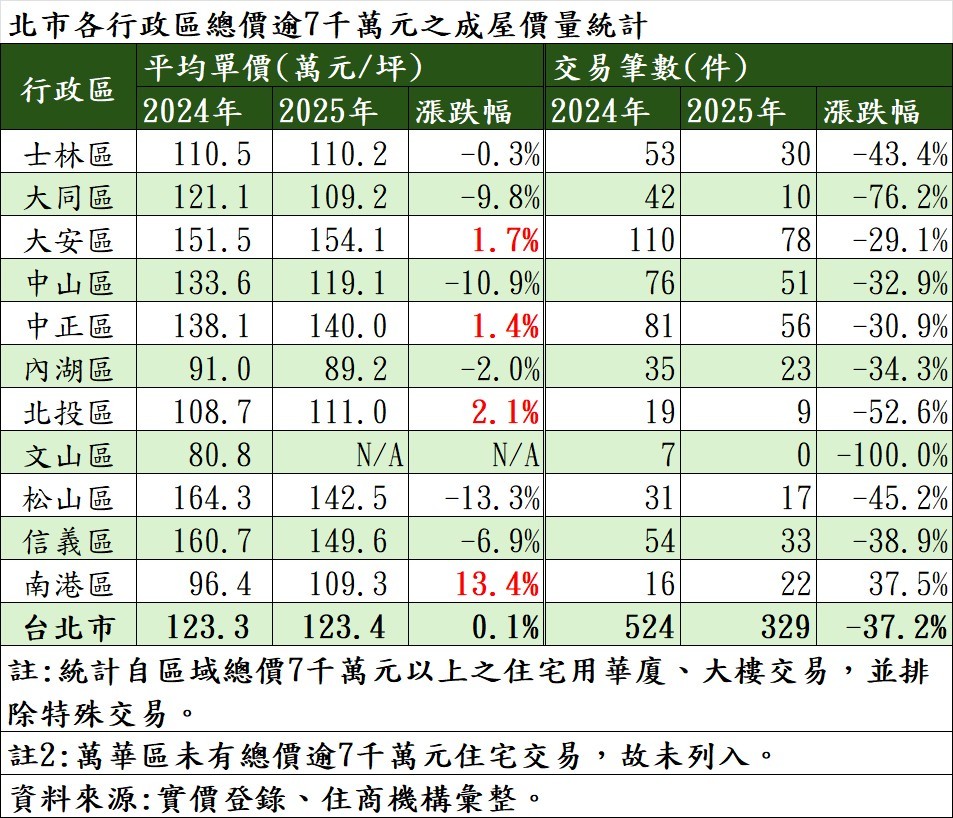 統計顯示,北市總價逾7,000萬元的成屋豪宅市場,2025年交易筆數相較2024年下滑37.2%,且各行政區皆呈現大幅量縮,不過在價格表現上,則具支撐力道,平均成交單價仍維持每坪約123.4萬元,相較2024年維持平盤;其中,若細看各行政區表現,以北市豪宅仍維持漲勢的區域主要分為兩大類型,一是正蛋黃區的大安與中正區,二是具重劃區、大型建設或有產業園區題材的北投與南港區。