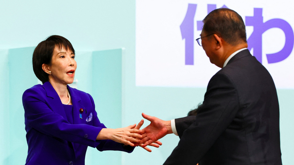 2025年10月4日,新當選的自民黨黨魁高市早苗,與日本首相石破茂握手。路透社