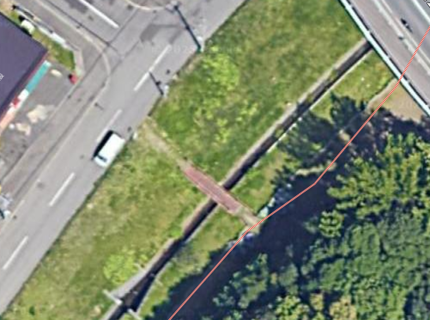北海道札幌市10月20日晚間發生棕熊與人在住宅區近距離遭遇事件,棕熊從河流的便橋(圖中土色構造物)方向爬上左方的道路,逼近到距離人只有2公尺。翻攝Google地圖