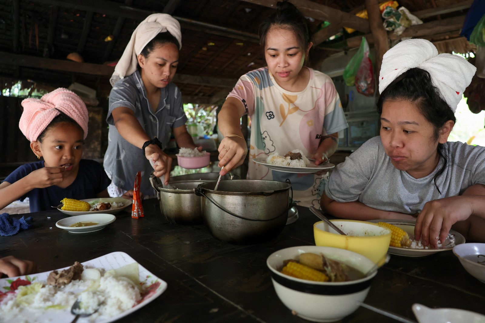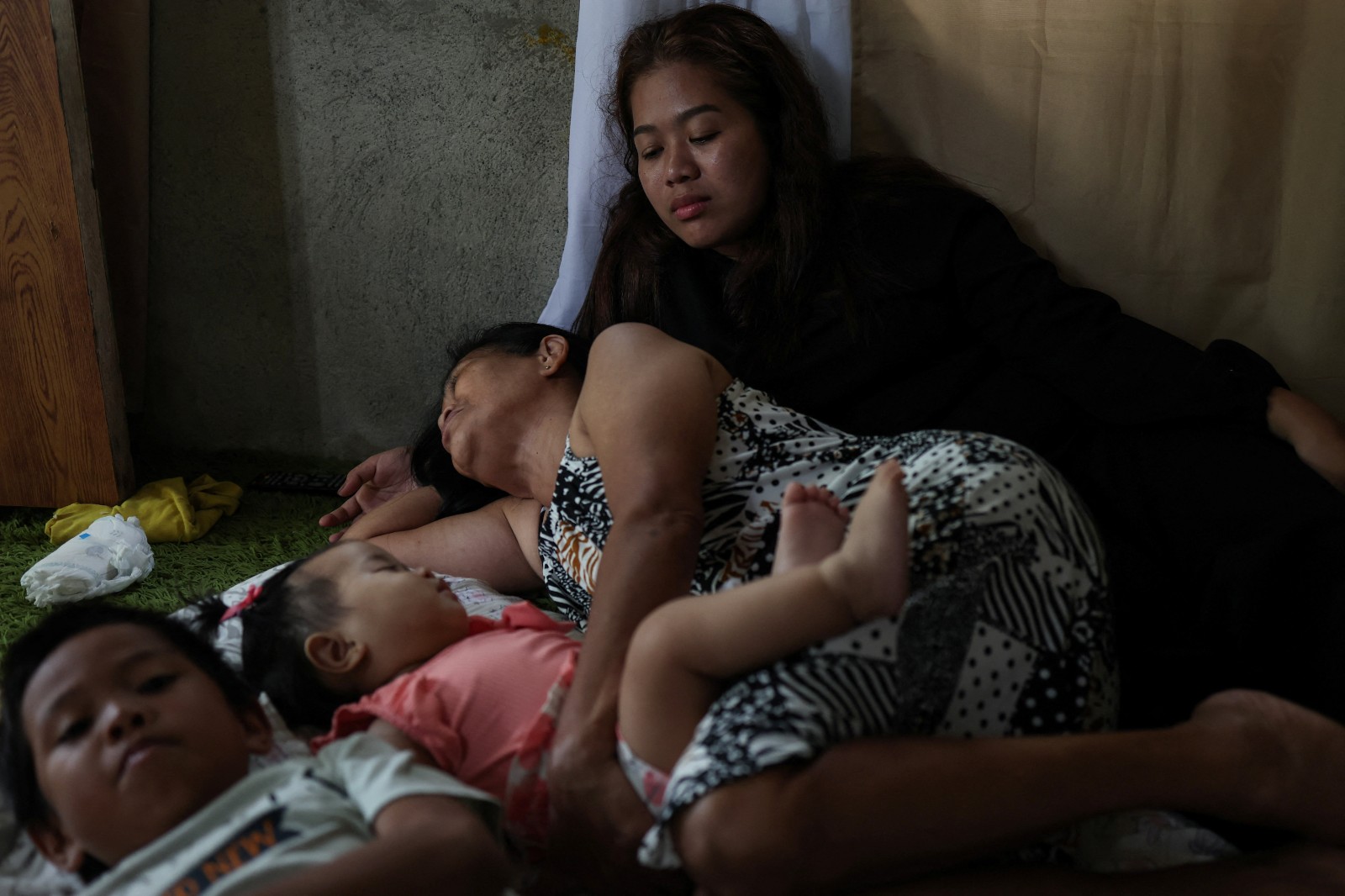 杜哈帕(右起)今年3月與媽媽、女兒在呂宋島家中客廳的地板上休息。路透社