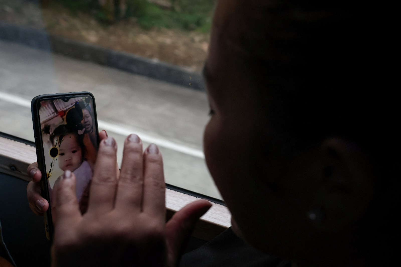 今年3月杜哈帕從呂宋島出發來台找工作,車上看著7個月大女兒的照片。路透社