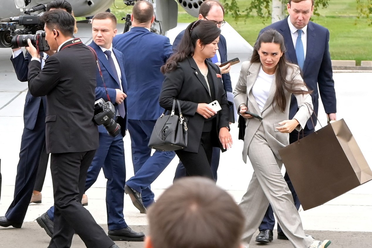 2023月9月14日,北韓勞動黨中央第一副部長金與正(左)陪同領導人金正恩訪俄。路透社/KCNA