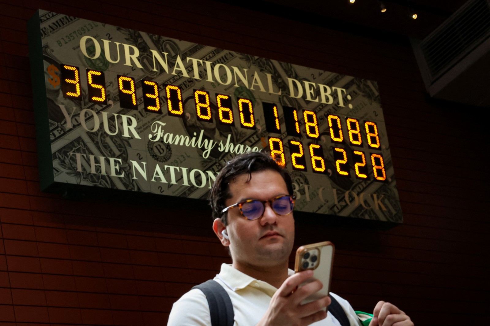 2025年7月1日,位於紐約市第六大道的國債鐘顯示,美國國債已逼近36兆美元。路透社