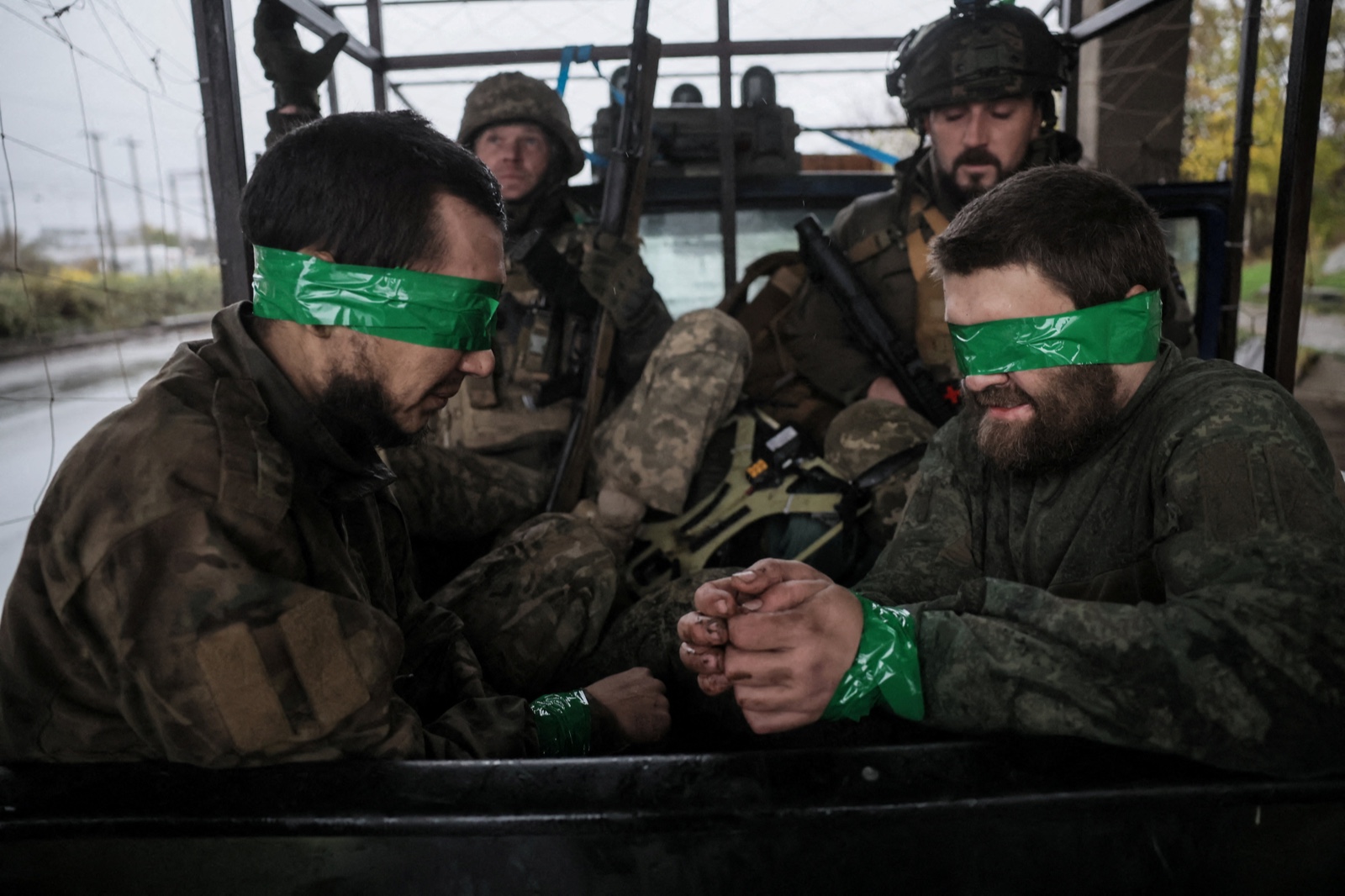 2025年10月27日,駐紮頓內次克的烏克蘭軍人,押解2名俄羅斯戰俘。路透社