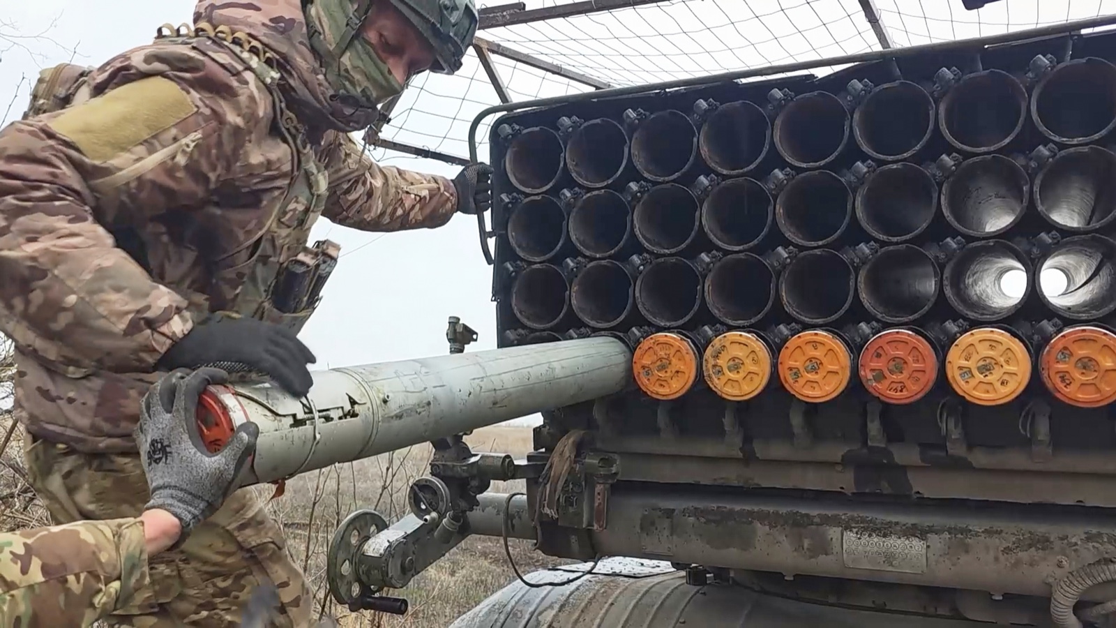 2025年11月6日,一名俄羅斯士兵在烏克蘭裝載旋風-G多管火箭砲。美聯社