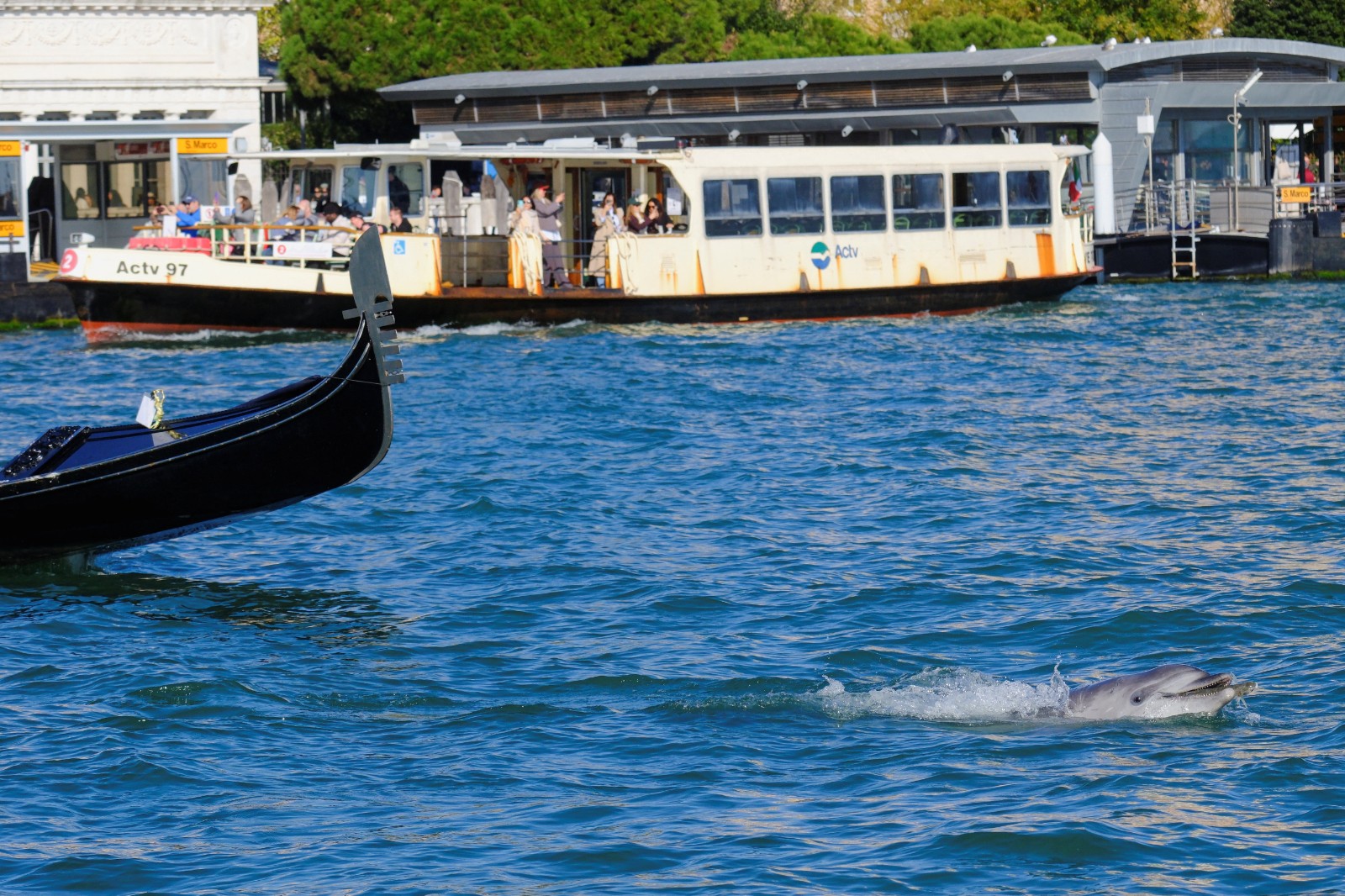 2025年11月8日,瓶鼻海豚迷莫在威尼斯聖馬可廣場附近的潟湖水域出沒。路透社