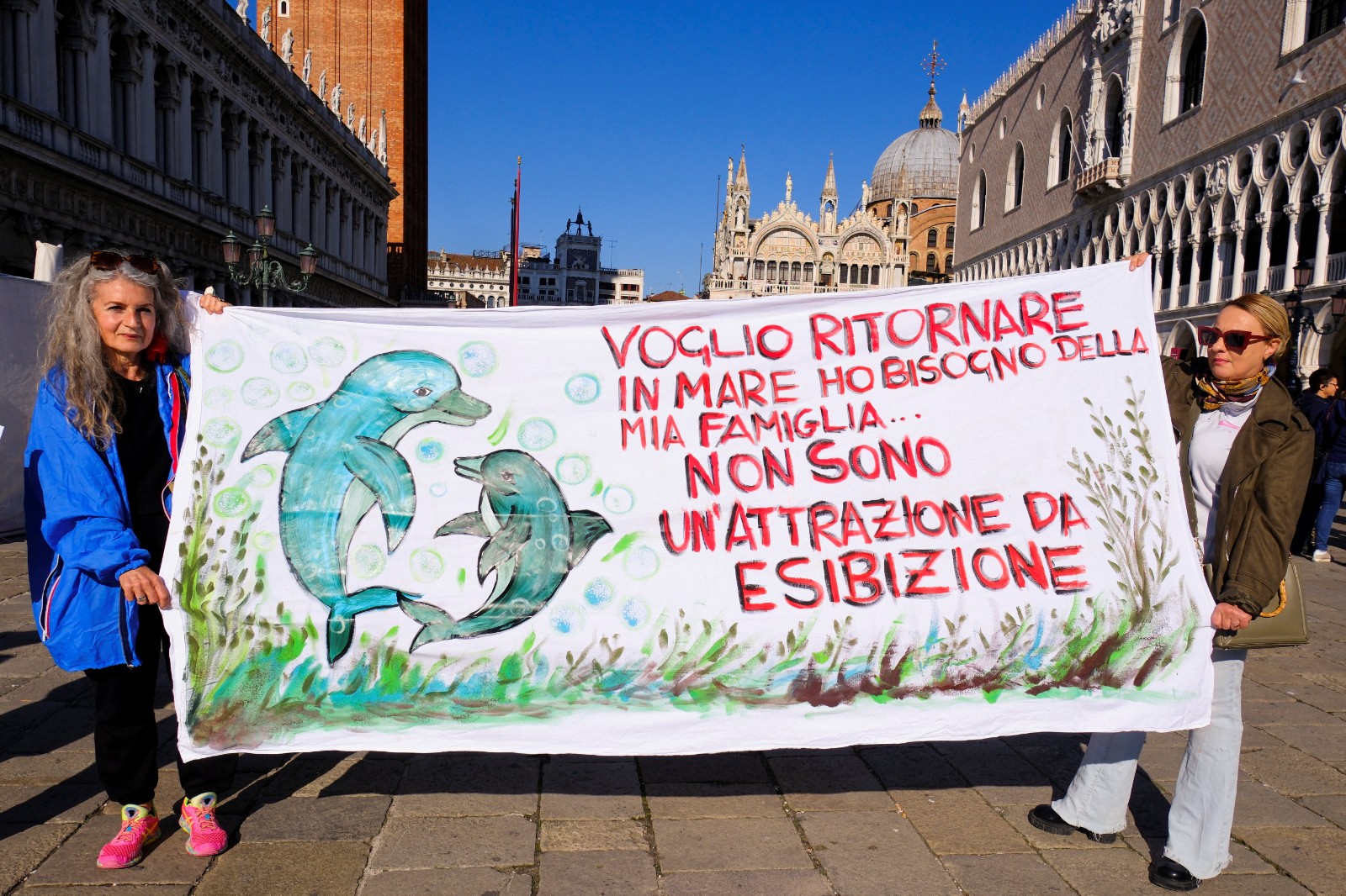 2025年11月8日,威尼斯民眾呼籲大家保護瓶鼻海豚迷莫。路透社