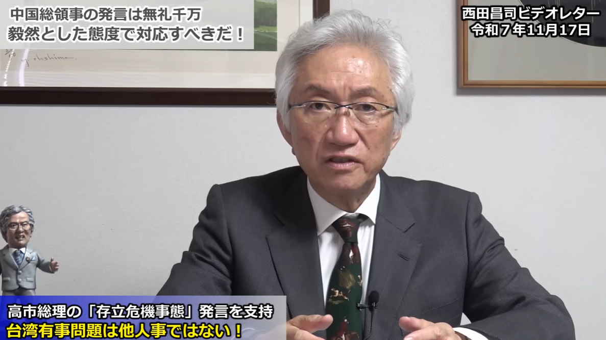 2025年11月17日,自民黨參議員西田昌司在YouTube頻道上,強烈批評薛劍的言論。翻攝西田昌司YouTube頻道