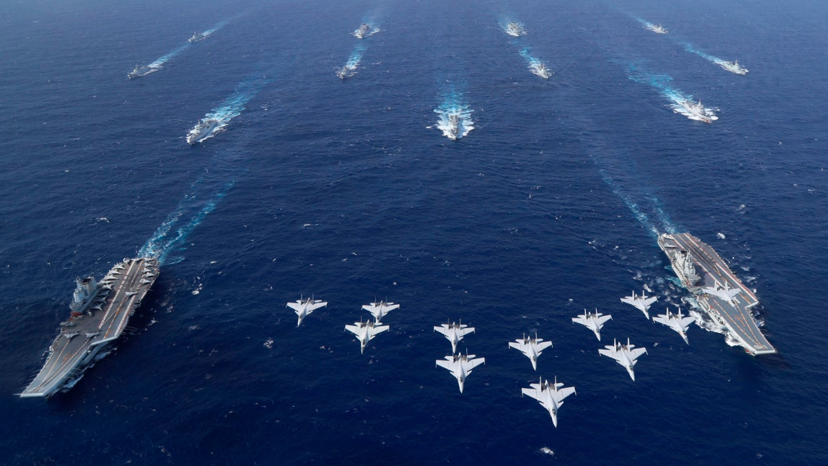 中國航空母艦遼寧號與山東號在南海編隊航行的畫面。美聯社