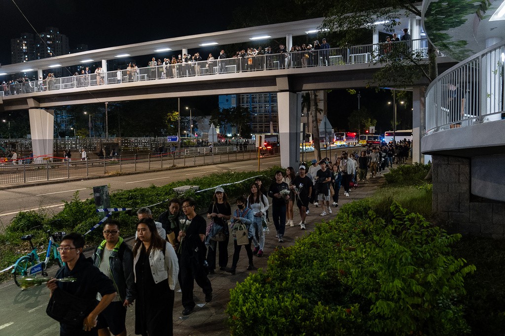 2025年11月30日,香港宏福苑大火後,大批民眾前往獻花致意,人龍一度綿延兩公里。美聯社