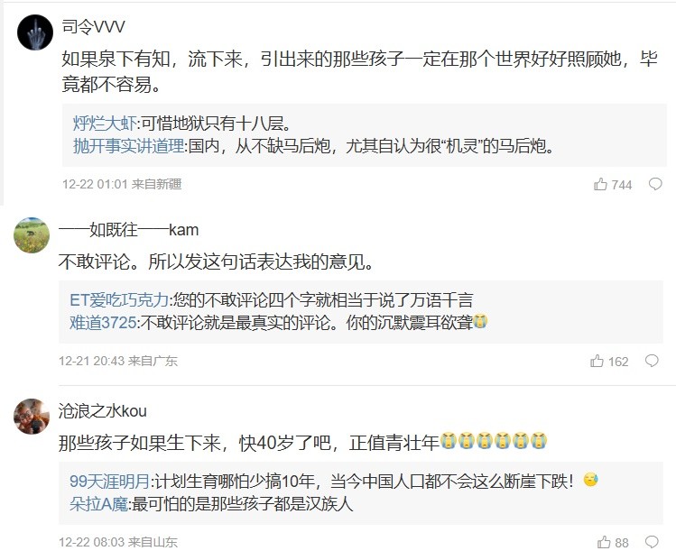 有網友在微博留言區寫著:「如果泉下有知,流下來,引出來的那些孩子一定在那個世界好好照顧她,畢竟都不容易。」該網友指的是,中國從1980年至2015年執行一胎化期間,會強迫超生婦女進行人工流產。