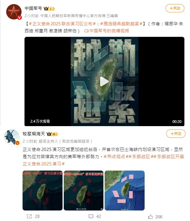 中國解放軍東部戰區今早宣布在台灣周遭舉行「正義使命-2025」軍演,並發布最新「繞台軍演」,並發布名為「正義之盾」的宣傳海報。路透社在報導中指出,此為中國首次針對「外部勢力」進行恫嚇。