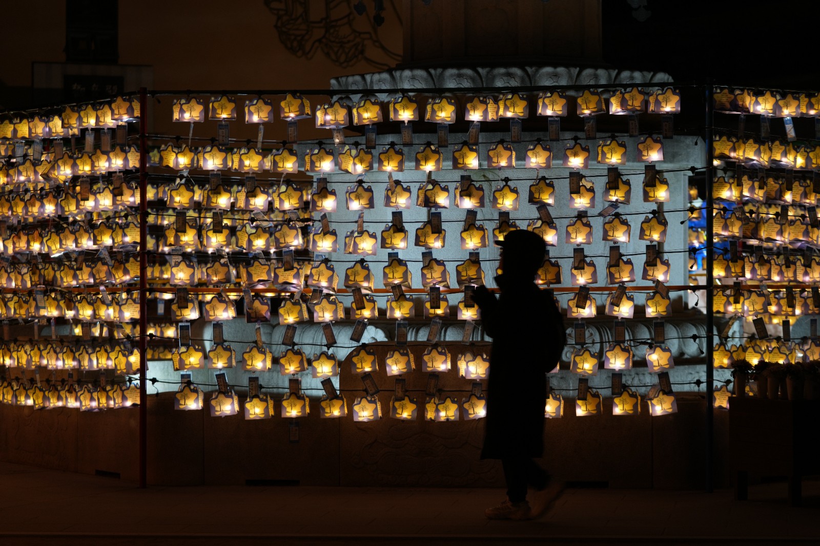 南韓首爾的曹溪寺在2025年12月31日晚間掛著燈籠,一民眾在燈籠前祈禱2026新年順利。美聯社
