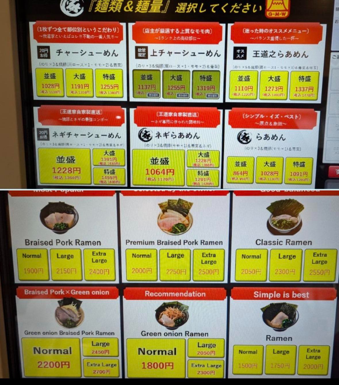 綜合日媒報導,小有名氣的大阪家系拉麵店「王道家直系 我道家 OSAKA店」店內的點餐機有英日語兩套菜單,但是價格差異頗大。以叉燒拉麵為例,日語菜單中普通碗、大碗與特大碗的含稅價分別為1130、1310和1380日圓(約228、264和278元台幣),不過英語版菜單的含稅價則分別為1900、2150和2400日圓(約382、433和483元台幣)。