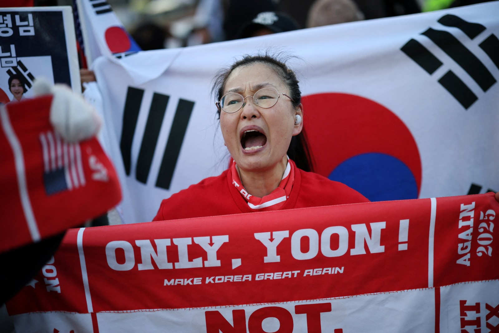 2026年1月13日,南韓前總統尹錫悅出庭期間,支持者在首爾法院外呼口號相挺。路透社資料照
