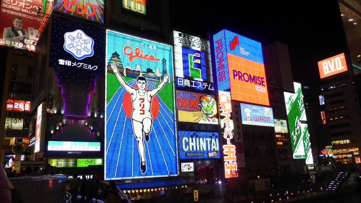 日本大阪道頓堀的「格力高(glico)跑跑人」是知名拍照打卡熱點,圖為第五代看板。翻攝維基百科