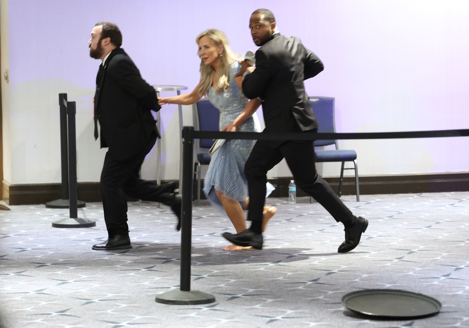 美國總統川普昨晚(4/25)出席在華府希爾頓飯店參加晚宴時,飯店傳槍響,前總統甘迺迪姪女凱莉為宴會賓客之一,她說先是聽到很大聲槍響,周圍許多人喊「趴下趴下趴下」,大批特勤衝入宴會廳緊急撤離川普夫婦及重要閣員,他們手按著槍套,隨時準備拔槍,安全人員對賓客大喝「走走走」,引導賓客離開現場。
