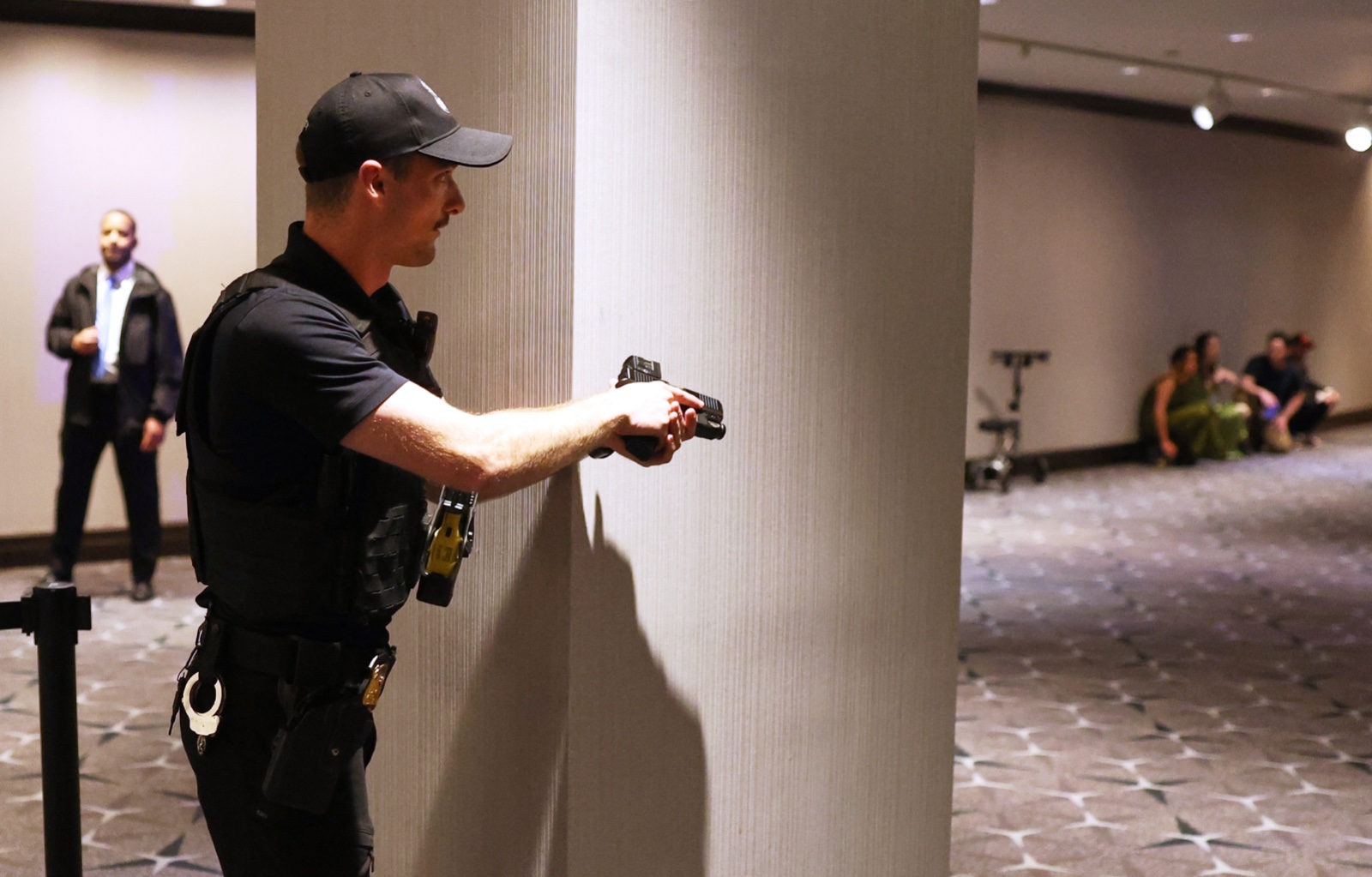 2026年4月25日,美國總統川普在華府希爾頓飯店參加白宮記者協會晚宴時,飯店傳槍響,特勤及其他執法人員緊急戒備。美聯社