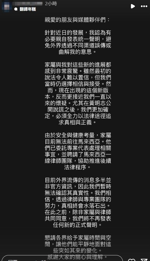 Chris指出,由於安全與健康考量,謝侑芯的家屬暫無法前往馬來西亞,已委託專業代表處理後續事宜,並聘請當地知名律師團隊推進司法程序。
