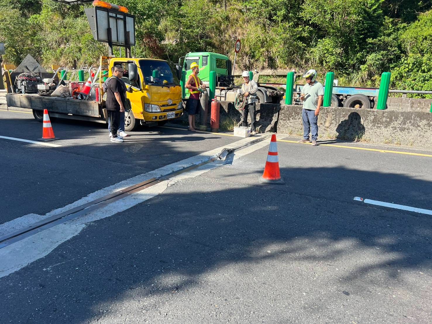 台62線伸縮縫角鋼翹起 刺破30輛車車輪。警方到場交管。讀者提供