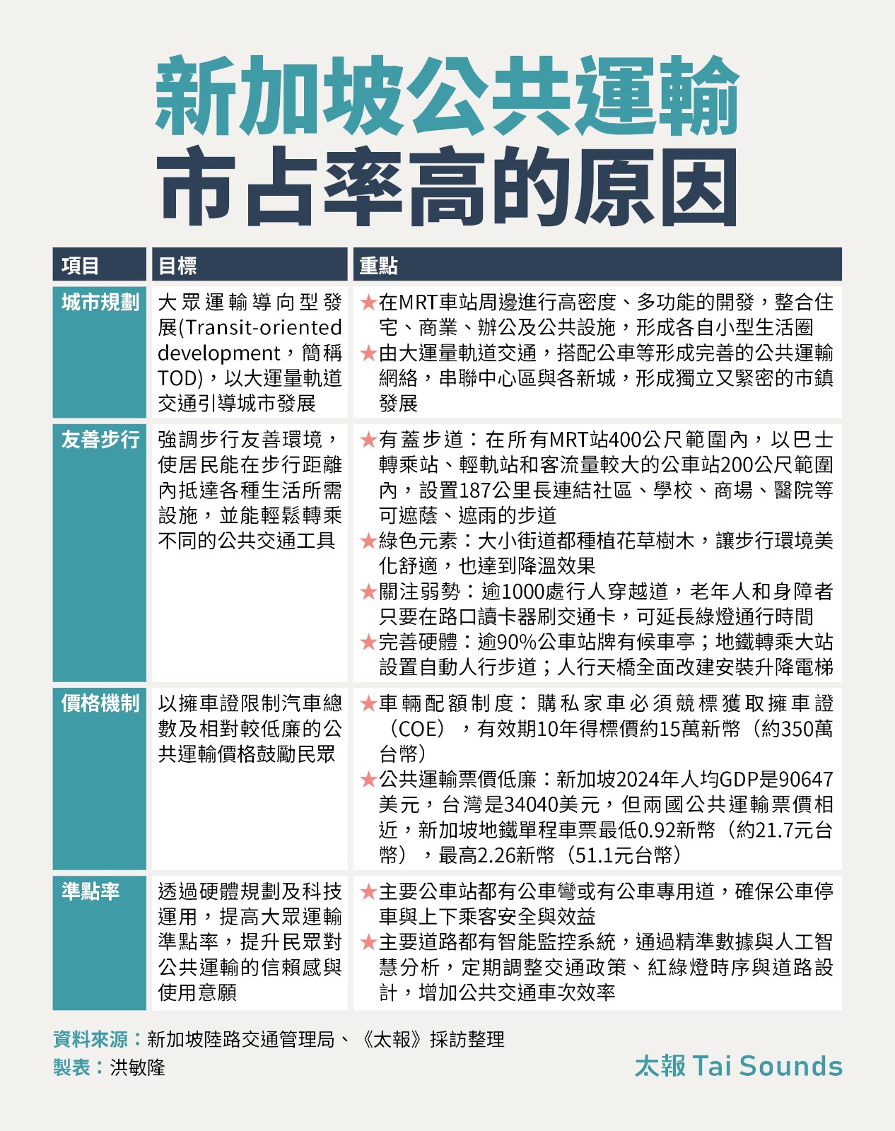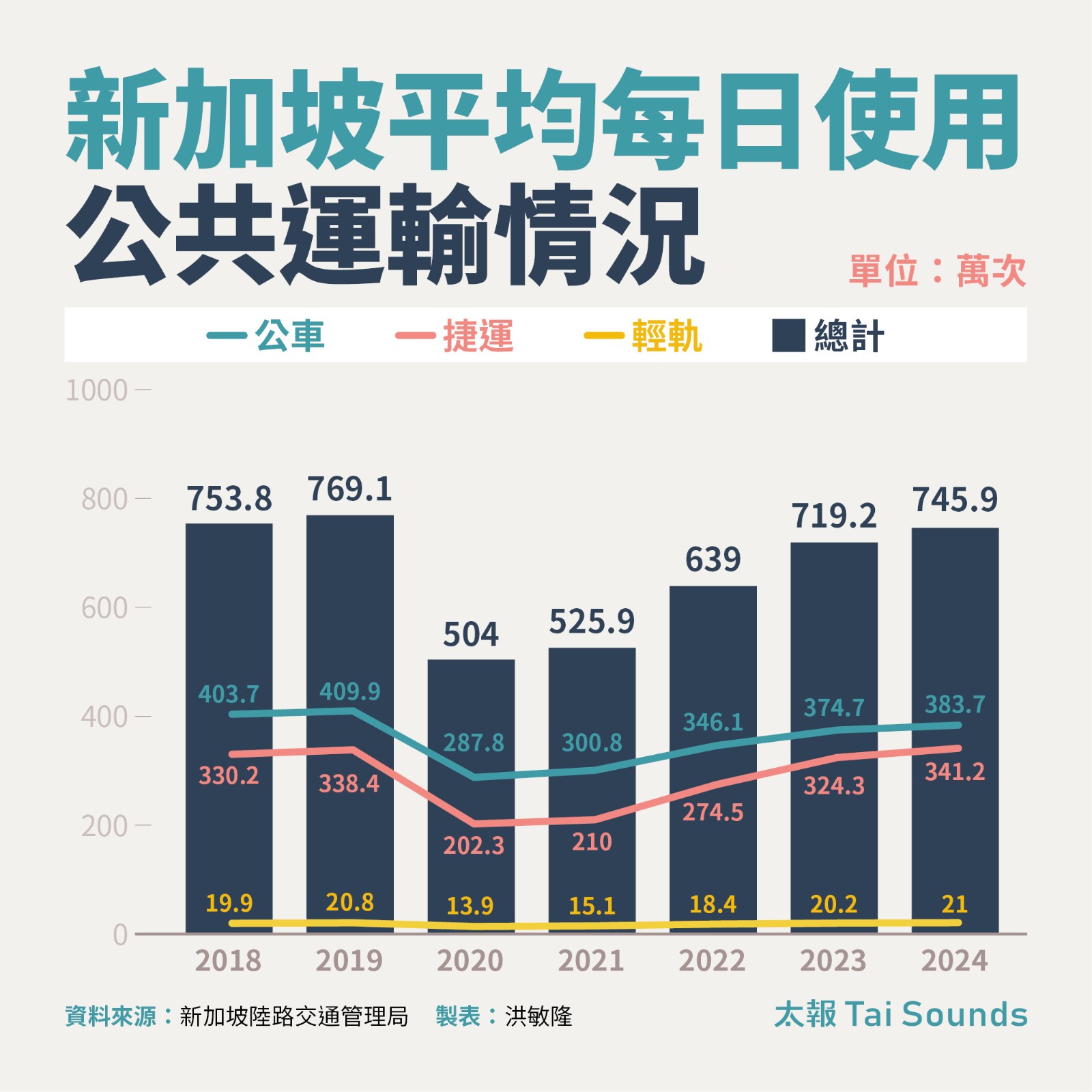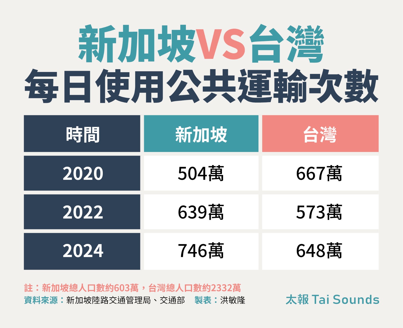 新加坡國土面積僅710.2平方公里,不到新北市的三分之一,相較於人口數2332萬的台灣,2024年每日平均僅有648萬人次使用公共運輸,人口數約603萬的新加坡,已經達到746萬人次,且公共運輸市占率已將近8成,反觀台灣整體公共運輸市占率只有15.2%,就連最好的台北市(38.3%)和新加坡也有一大段差距。