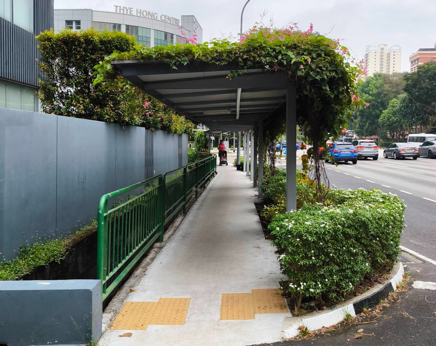 觀察新加坡的有蓋步道,不僅全天可遮蔭遮雨,而且步道兩側都植栽綠樹或綠地,如同新加坡另一美譽「花園城市」,原本冷冰冰的長廊因為綠意盎然,步行起來更加舒適,這兩年有蓋步道開始也披上「綠衣」,新加坡政府選擇數種不會過重以免有蓋設施無法支撐,且不須經常澆水、修剪的樹種植物覆蓋有蓋步道屋頂,達到步道降溫的效果,也避免這些設施因天氣而導致熱漲冷縮的程度,有助延長壽命。