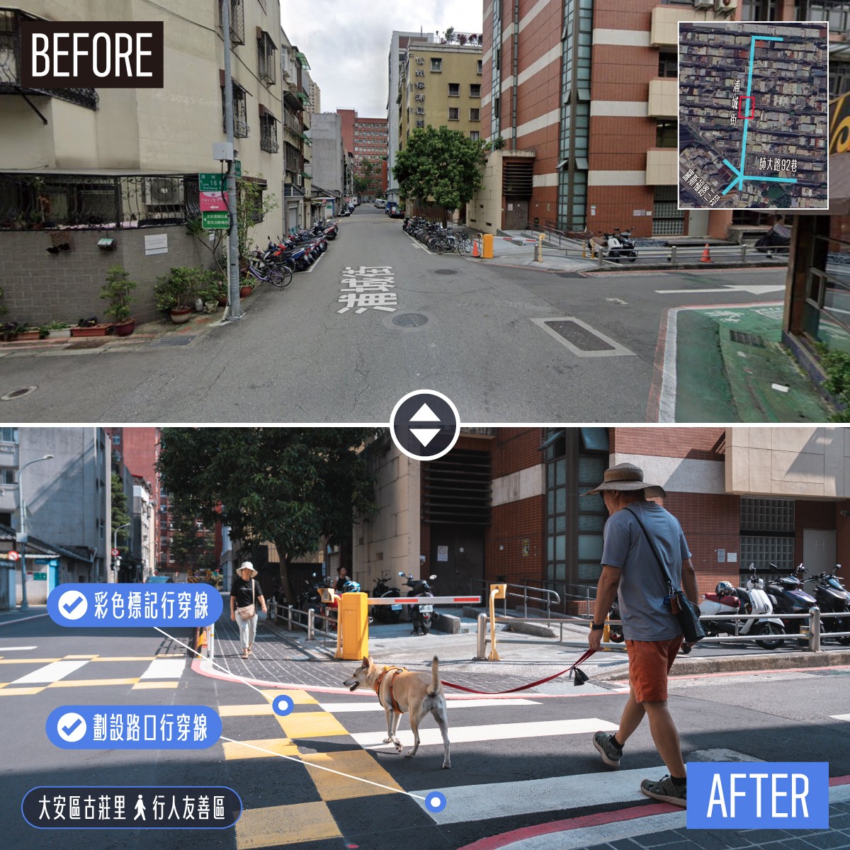 北市府先前表示,市長蔣萬安2023年考察新加坡樂齡安全區後,於大學里推動全國第一處行人友善區,其後再於師大附近的龍泉里、古莊里建置行人友善區,以及在信義區嘉興里設置規定更嚴的「行人優先區」。