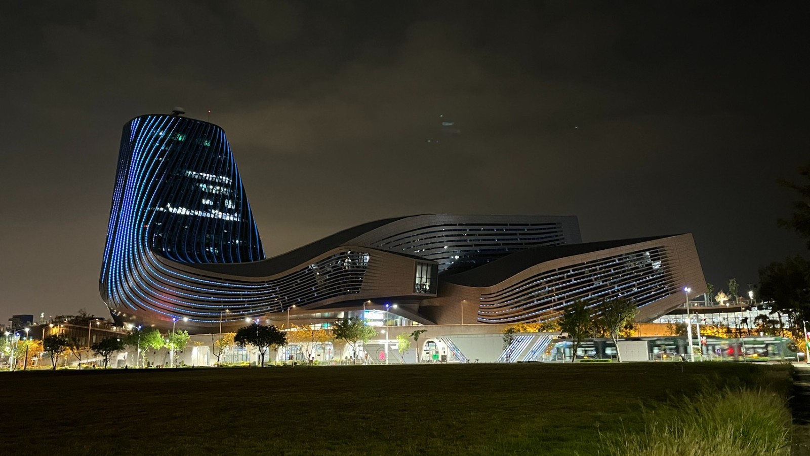 迎接韓國女團TWICE,高雄18日起知名地標換上藍燈應援。讀者提供