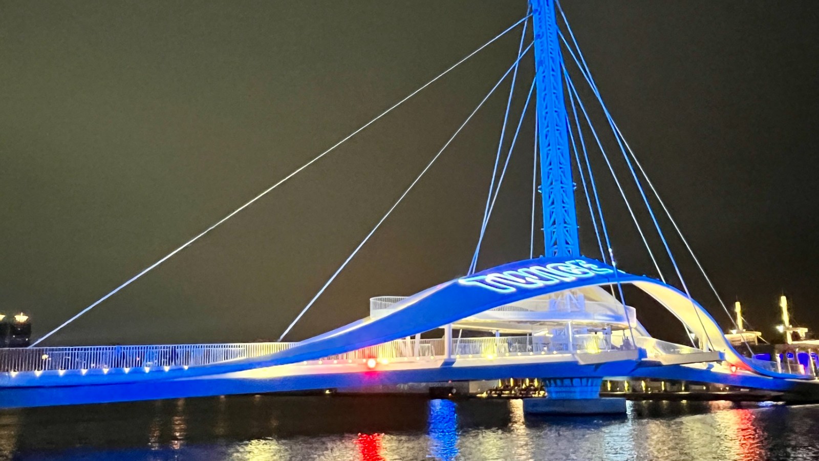 迎接韓國女團TWICE,高雄18日起知名地標換上藍燈應援;大港橋打上字幕。讀者提供