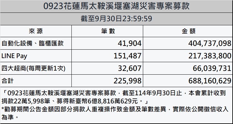 賑災基金會今(1)日公布「0923花蓮馬太鞍溪堰塞湖災害專案募款」最新進度,累計已收到捐款破22.5萬筆、募得超過新台幣6.8億元。