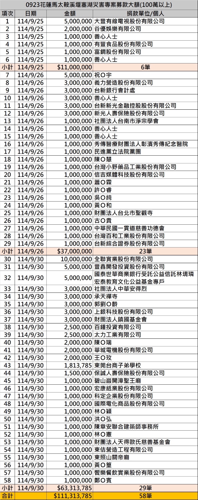 衛生福利部所屬賑災基金會在行政院指示下,自9月25日啟動「0923花蓮馬太鞍溪堰塞湖災害專案募款」,原訂一個月內籌得5億元,未料短短5天就達標,創下歷來最快紀錄。今傍晚公布最新進度,截至9月30日,專案已累計收到22萬5998筆捐款,總金額達6億8816萬629元,其中捐款超過百萬元的大額善款共有58筆。
