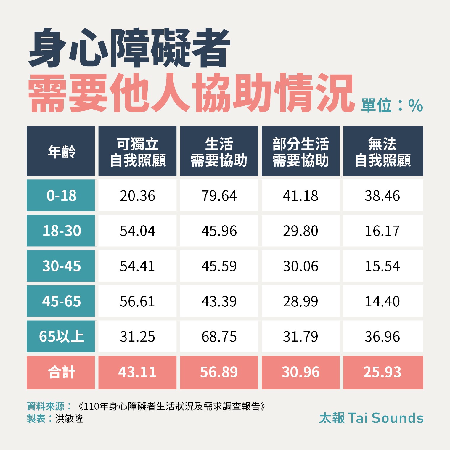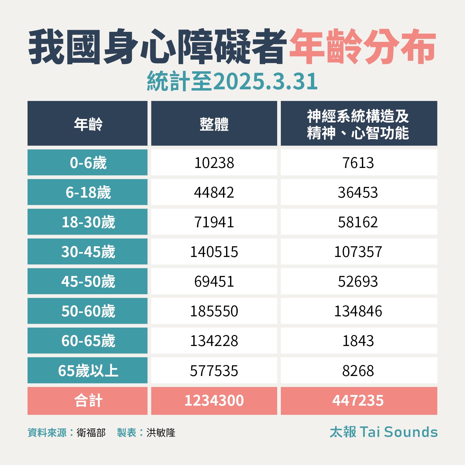 根據衛福部統計,全台有123.4萬名身心障礙者,將近6成是60歲以上,他們比一般人面臨更早的老化速度,常在45歲左右出現功能退化,心智障礙者老化速度更快,常在35歲左右開始出現老化現象,45歲進入老年期。
