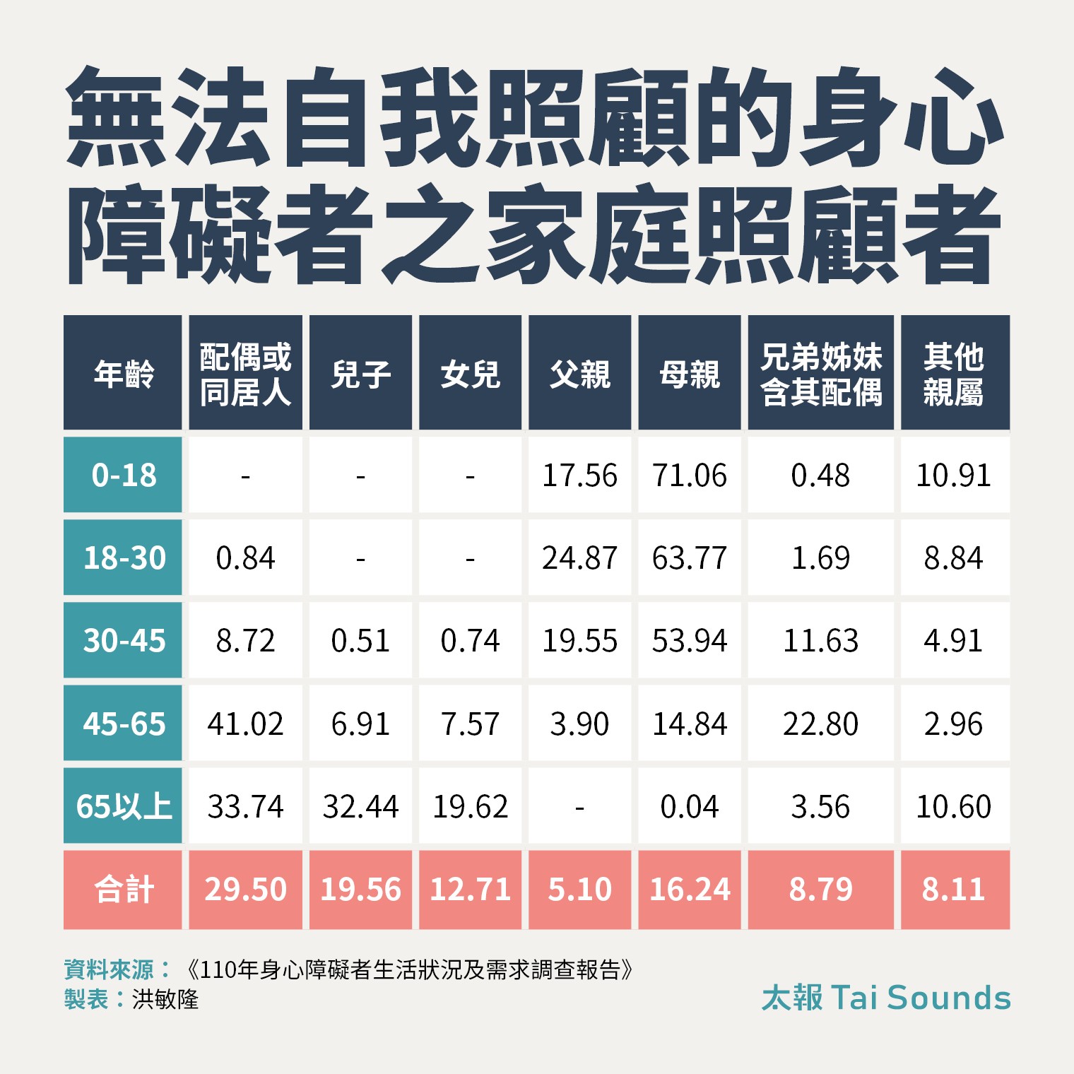 18至65歲身障者,仍以父母照顧居多