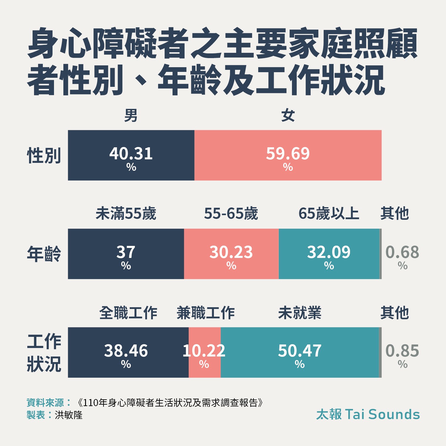 由於老化速度較快,協助30到65歲身心障礙者的主要照顧者,又以父母為主,衍生出「雙重老化」問題,尤其是許多心智障礙者,幾乎出生就由父母親開始照顧,很多父母就像阿宏的母親一樣,傾向不讓手足過早參與、不願影響其他手足既有生活,直到自己辭世,需要被照顧的身障孩子,一直是家長最深沉的擔憂。