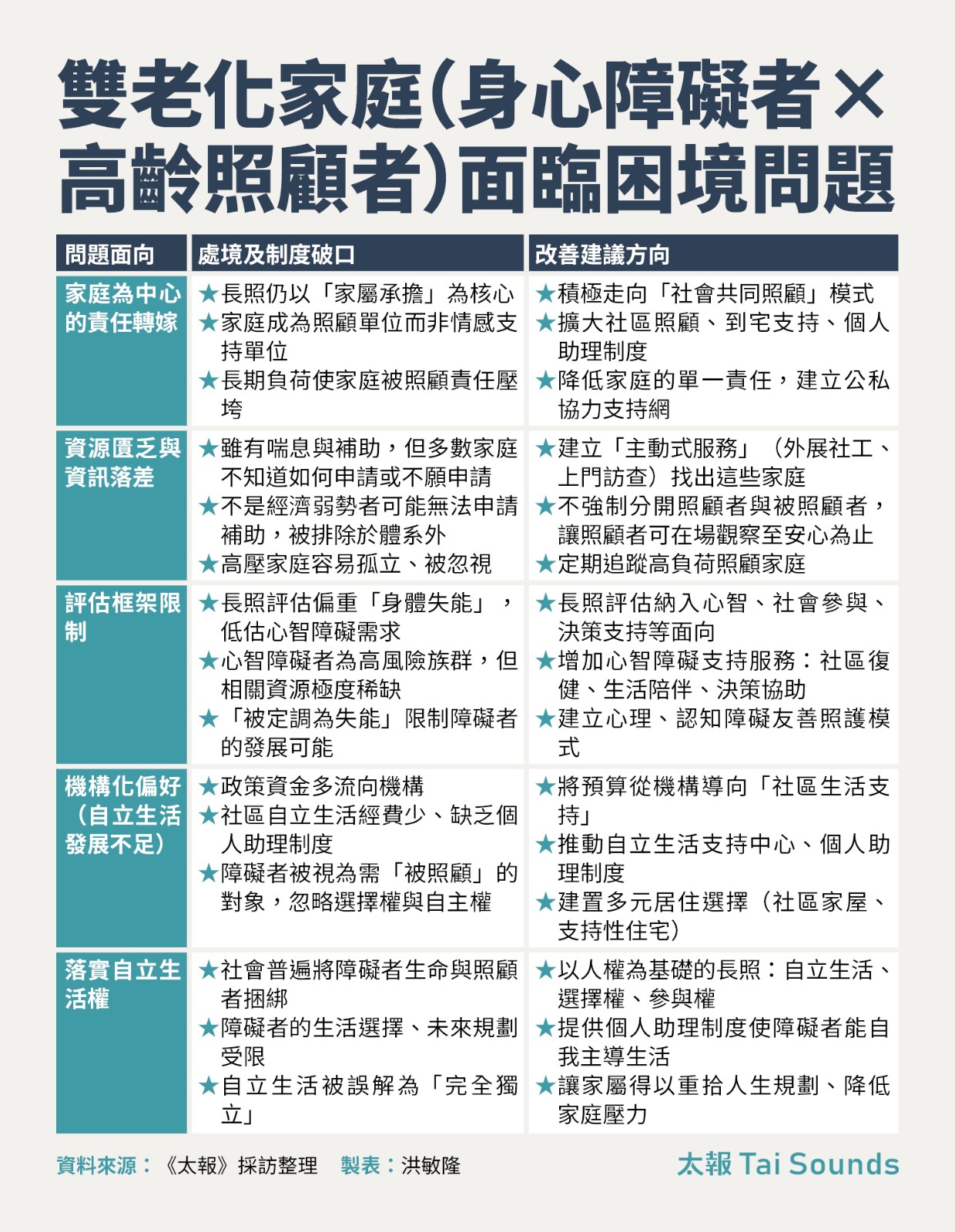 8旬老婦悶死照顧數十載的53歲重度身障兒,法官審理判2.5年刑期但建請總統特赦,引發社會關注及討論。然而,雙老化家庭(身心障礙者 × 高齡照顧者)的「長照殺人悲歌」事件並非偶然,核心問題是照顧者與障礙者雙方的人權都遭到忽略,障礙者支持服務缺口未解決,導致照顧責任長期落在家庭身上,類似悲劇恐怕會持續上演。