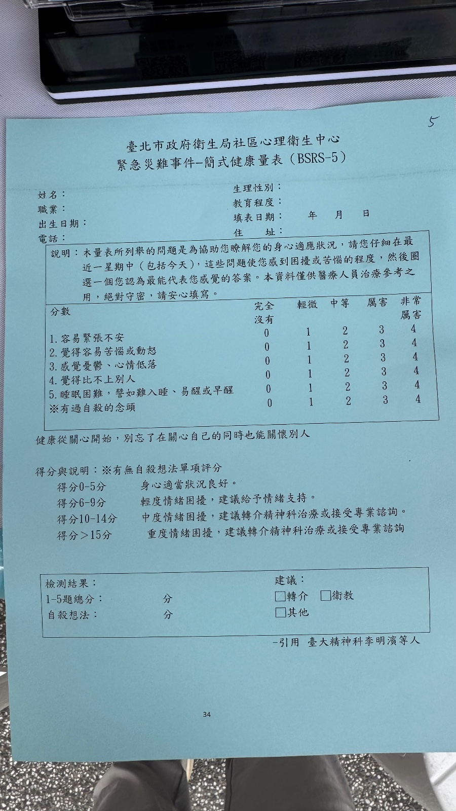 現場工作人員會先請民眾填寫簡式健康量表(BSRS-5),若分數超過10分,將轉介至隔壁帳篷由心理諮商師進行進一步評估與協助。據了解,關懷小站啟用短短兩個多小時內,首日即有兩名民眾量表分數超標,其中一人分數高達23分(滿分24分),並因恐慌症發作,需由現場人員協助緊急送醫。
