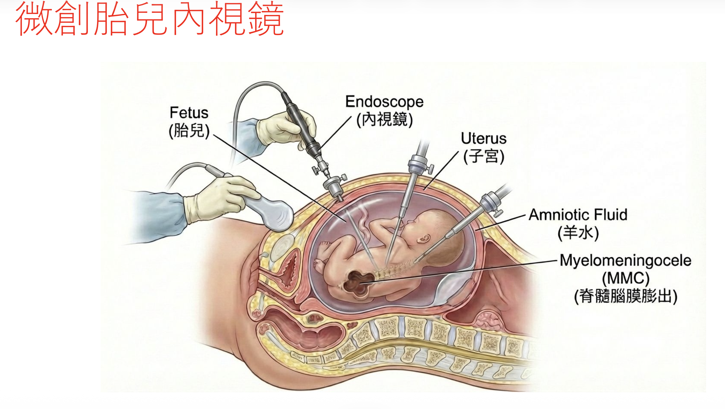 台北長庚醫院婦產科系主任蕭勝文表示,本案例採用的手術技術源自巴西,經長庚團隊改良引進。醫療團隊僅在孕婦腹部與子宮上打了三個微小的穿刺孔,利用二氧化碳將羊膜腔撐開,伸入內視鏡與精細器械。進行脊髓脊膜膨出修補手術過程中,醫師需在狹小的空間內,於暴露的脊髓神經上覆蓋一層特殊的「生物纖維素補片」並加以縫合完成。而傳統的「開腹式胎兒手術」則需切開母親腹部與子宮,風險高且可能導致早產或子宮破裂,生產方式也只能剖腹產。