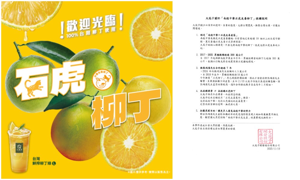 大苑子近日推出鮮搾柳丁綠,文宣中特別強調選用「友善耕作」的石虎柳丁,更主打來自南投中寮,但被長壽天然農場踢爆「只來拍片、1顆都沒買」。長壽天然農場強調今年並未供貨給大苑子,老闆女兒怒轟大苑子欺負農民。另外網友也發現,大苑子10月已搶先註冊石虎柳丁商標。對此,大苑子今天(11/20)滅火回應,已下架石虎柳丁的相關製作物,也取消申請商標。