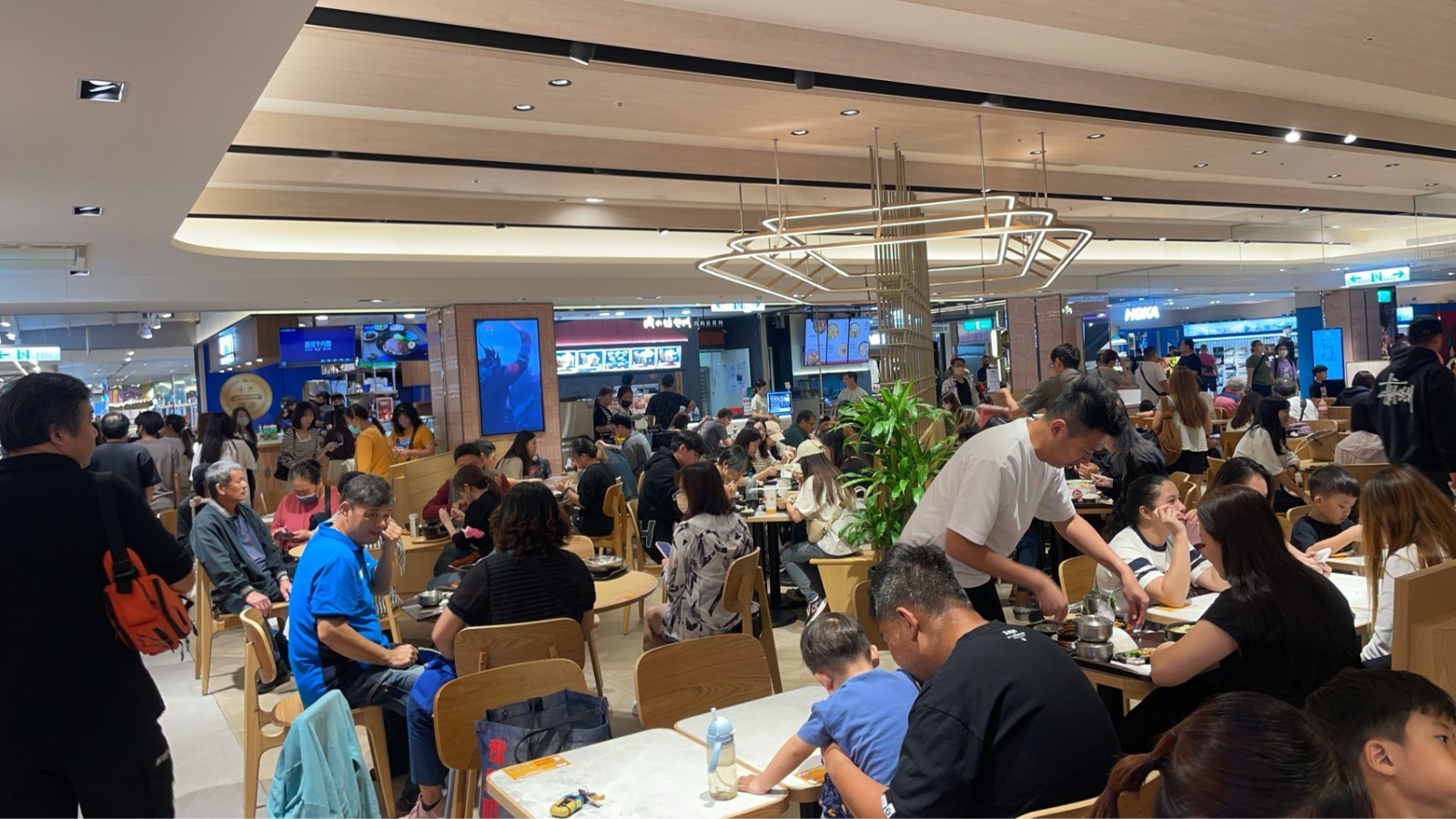 新光三越中港店湧入人潮,業者說:「全館人潮增加一成,主要為用餐需求,多集中於餐廳、小吃街。」而