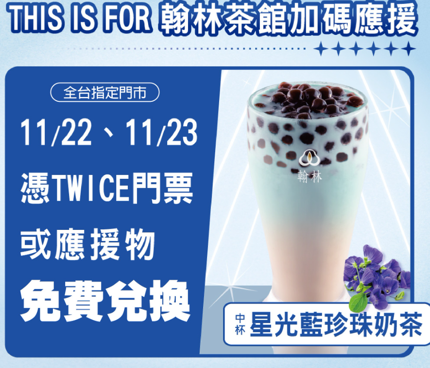 翰林茶館表示,即日起推出全新夢幻飲品「星光藍珍珠奶茶」,11月30日前購買還可享外帶半價優惠。另外,11月22、23日適逢TWICE演唱會,凡持演唱會門票或應援物即可免費兌換,送完為止。