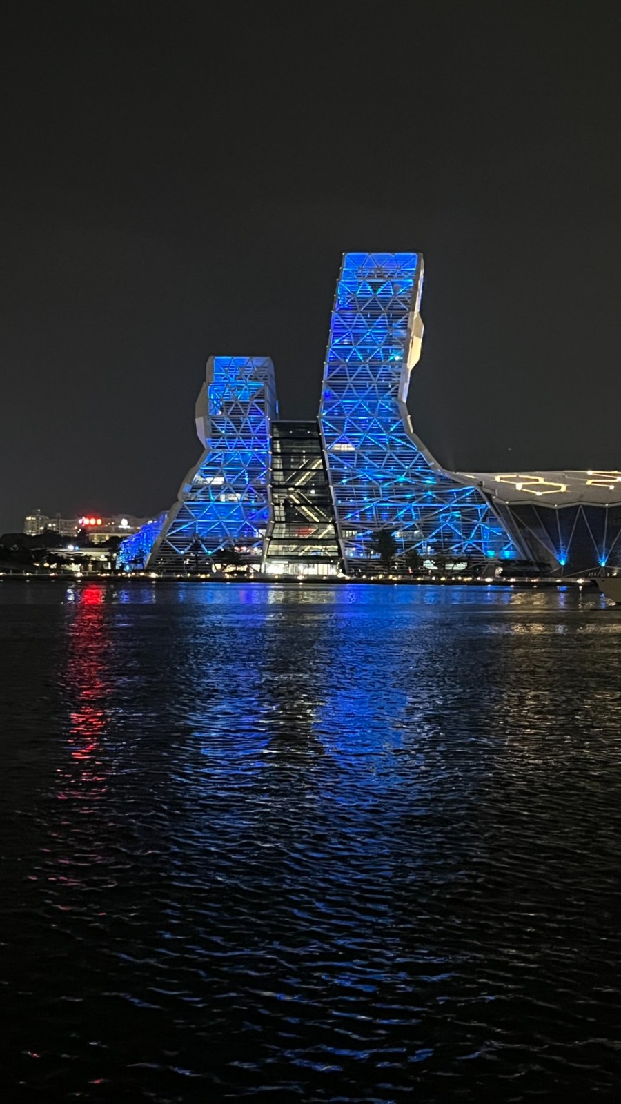 迎接韓國女團TWICE,高雄18日起知名地標換上藍燈應援;大港橋打上字幕。讀者提供