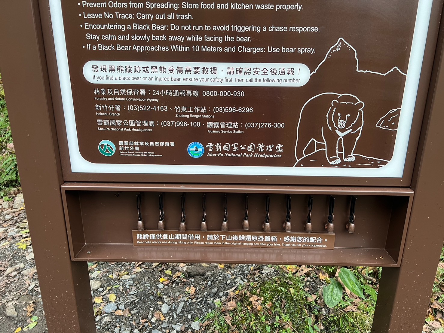 新竹分署表示,注意熊出沒告示牌外觀以大霸尖山意象為視覺主軸,並掛置大型熊鈴,兼具強化警示及保育宣導效果。牌面除介紹台灣黑熊活動痕跡外,也提醒民眾在山區活動應提高警覺,應妥善收存食物及廚餘,避免吸引黑熊靠近。告示牌下方為熊鈴掛置箱,提供山友借用與歸還,山友在上攀大小霸前可於15k處或19k處取用,下山後歸還原放置箱即可。
